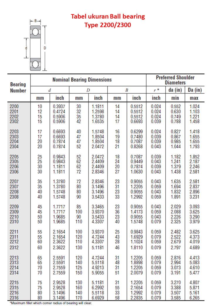 Tabel ukuran Ball Bearing. Type 2200 / 2300