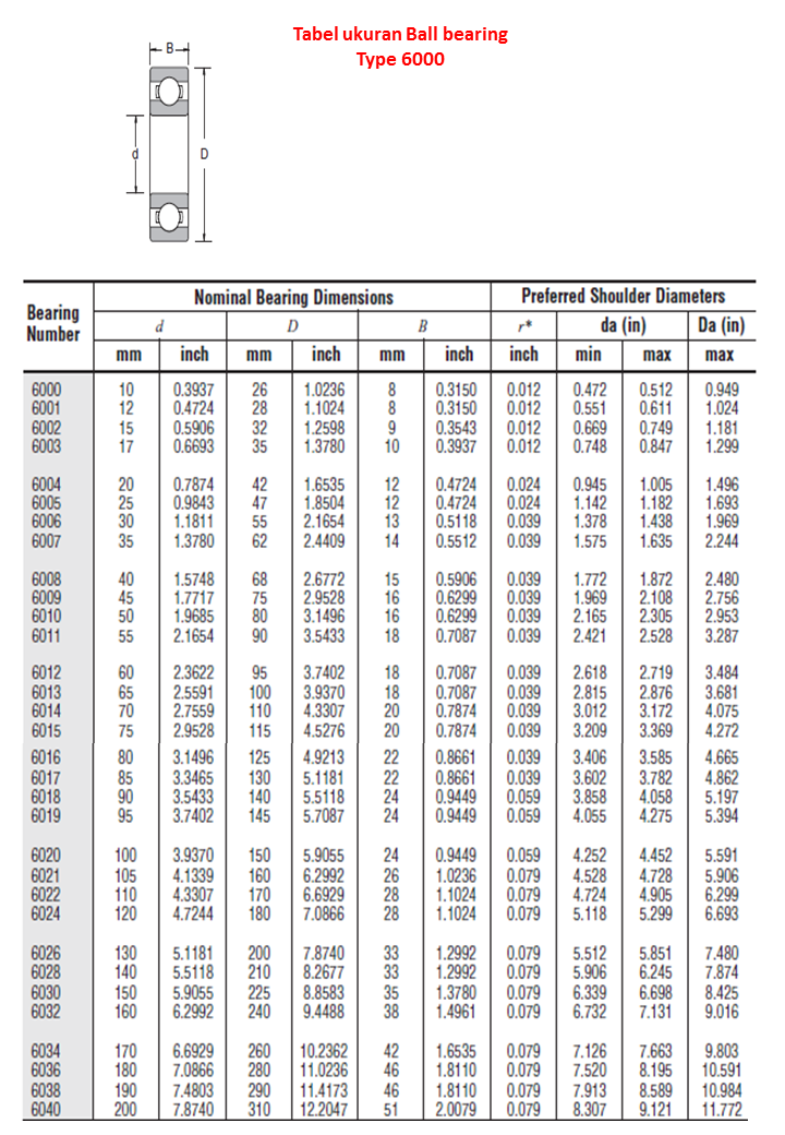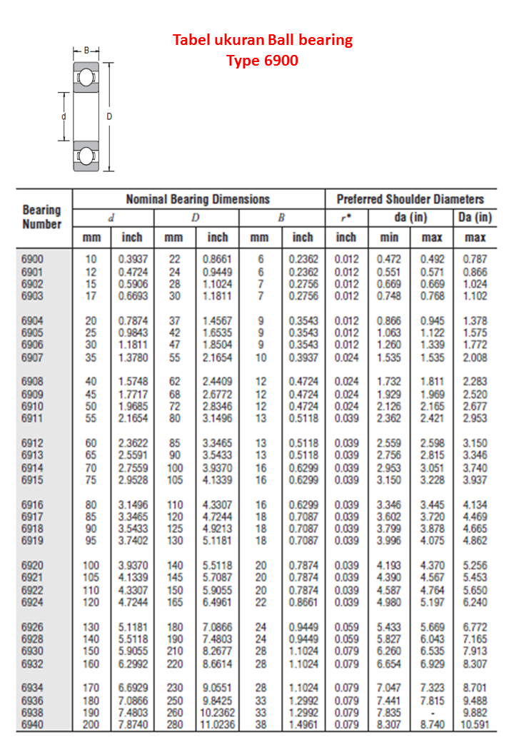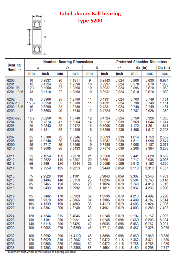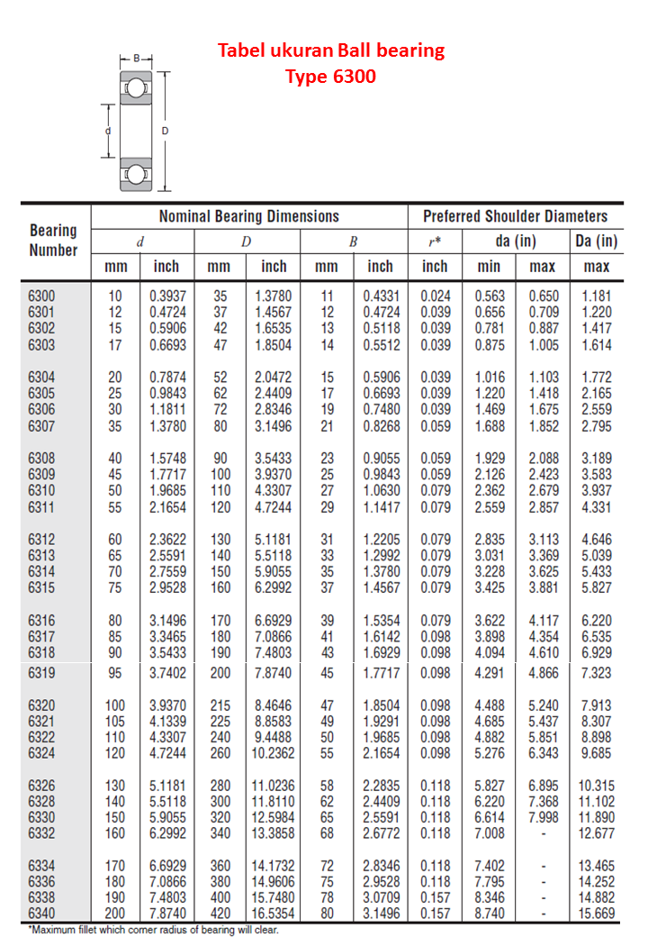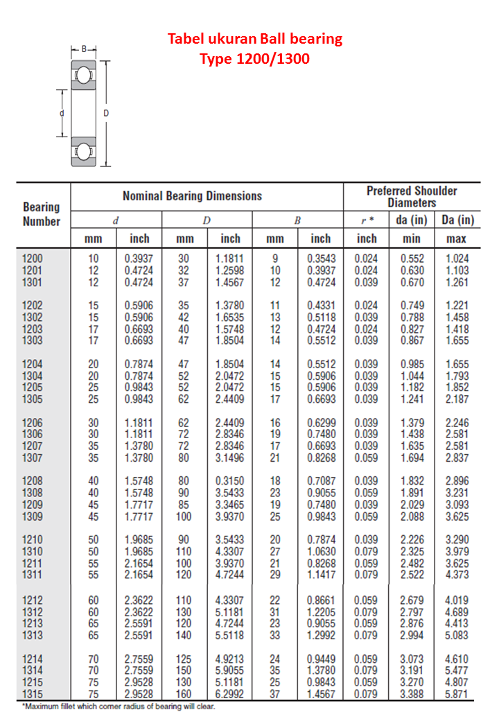 Tabel ukuran Ball Bearing. Type 1200/1300