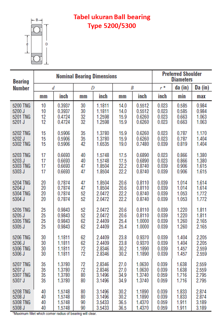 Tabel ukuran Ball Bearing. Type 5200 / 5300