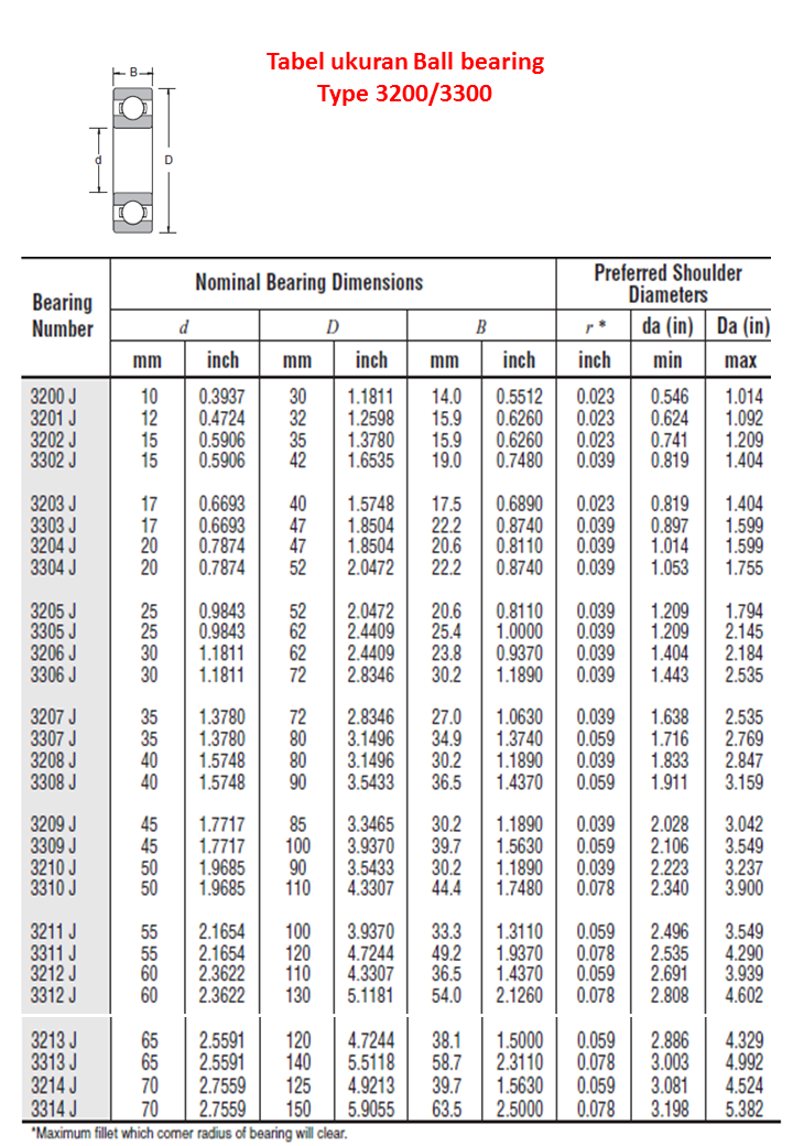 Tabel ukuran Ball Bearing. Type 3200 / 3300